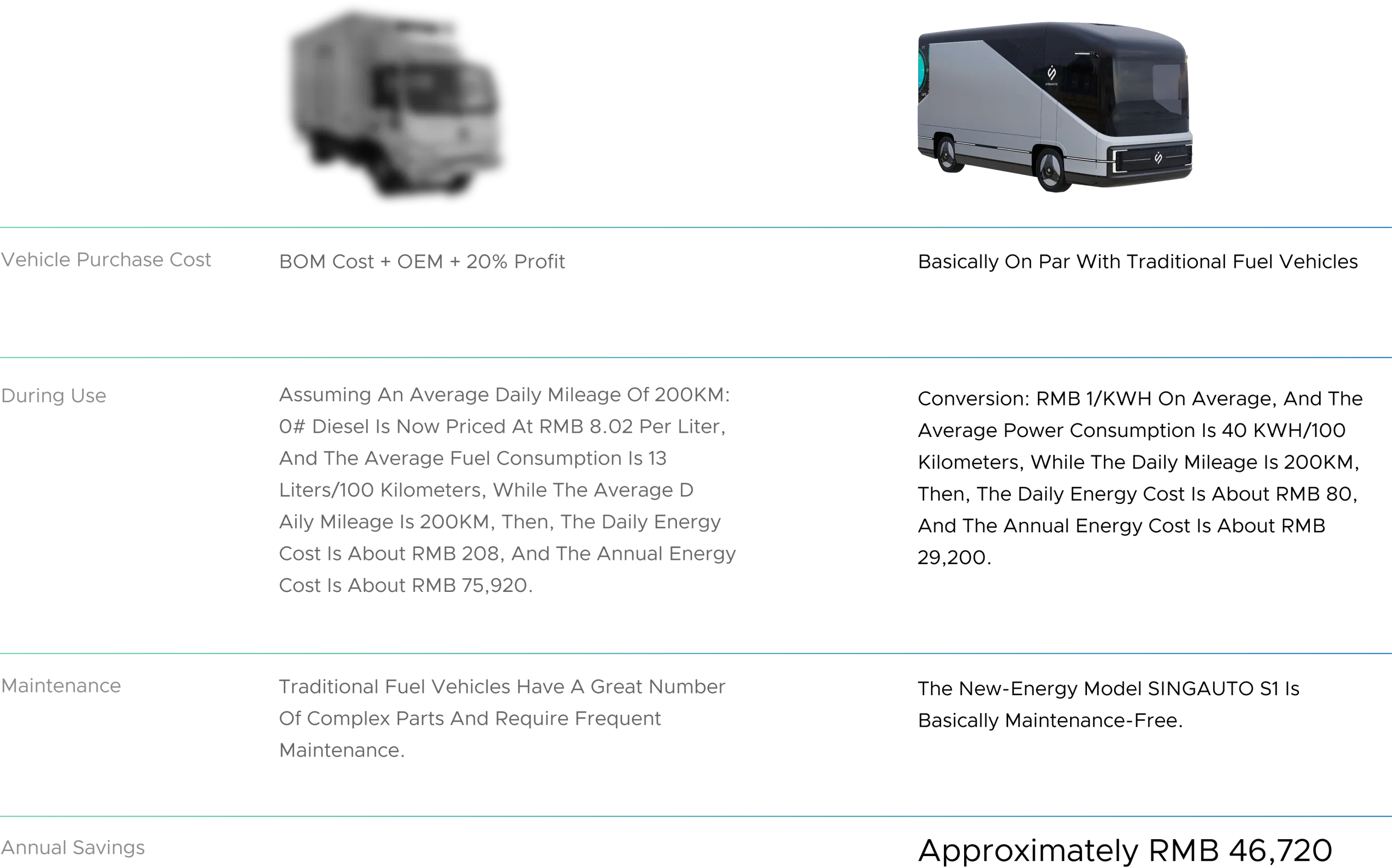 Assuming an average daily mileage of 200KM: 0# diesel is now priced at RMB 8.02 per liter, and the average fuel consumption is 13 liters/100 kilometers, while the average d aily mileage is 200KM, then, the daily energy cost is about RMB 208, and the annual energy cost is about RMB 75,920.